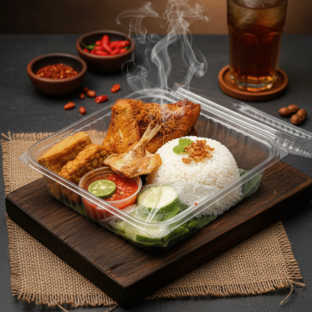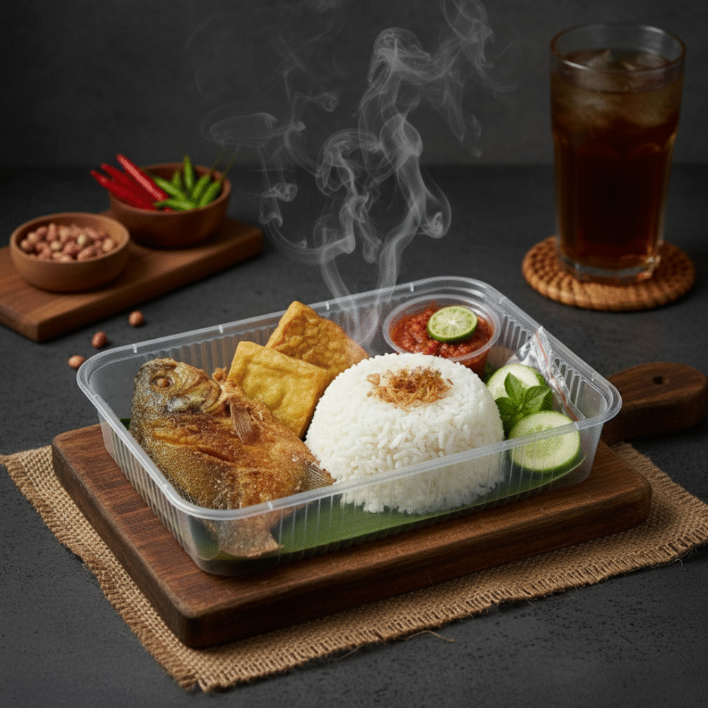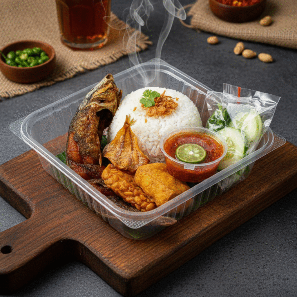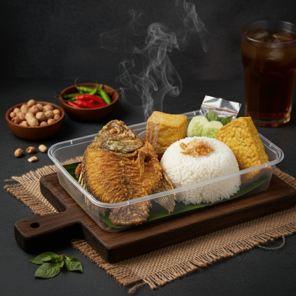 Nasi Putih, Bawal Goreng, Tahu, Tempe, Sambal Tempong, Lalapan