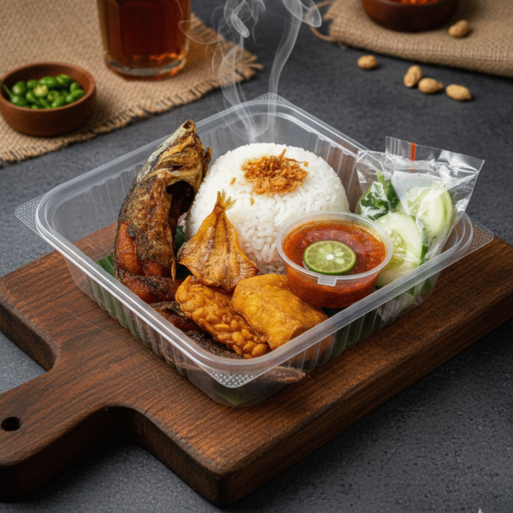 Nasi Putih, Bawal Goreng, Tahu, Tempe, Sambal Tempong, Lalapan
