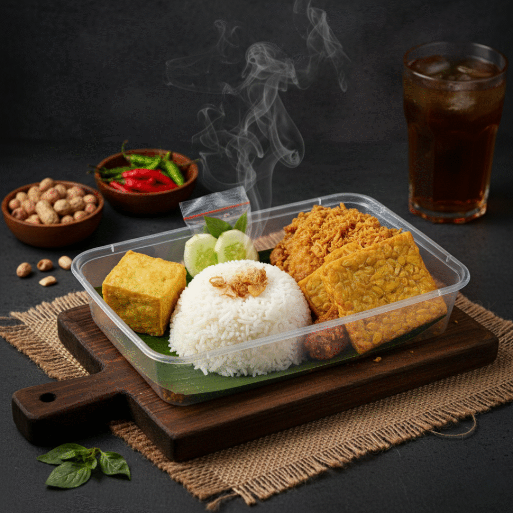Nasi Putih, Ayam Goreng Kremes, Tahu, Tempe, Sambal Bawang, Lalapan