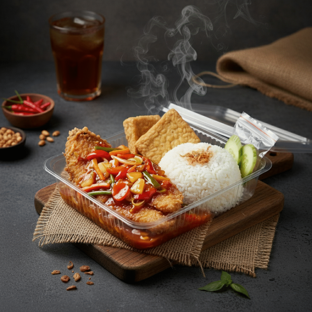 Nasi Putih, Ikan Kakap Asam Manis Tahu, Tempe, Sambal Bawang, Lalapan
